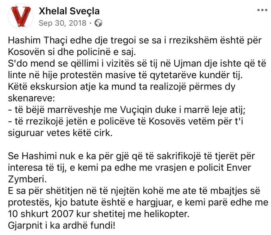 “S’do mend se qëllimi i vizitës së tij në Ujman dje ishte që të linte në hije protestën masive të qytetarëve kundër tij. Këtë ekskursion atje ka mund ta realizojë përmes dy skenarëve. -të bëjë marrëveshje me Vuciqin duke i marrë leje atij; -të rrezikojë jetën e policëve të Kosovës vetëm për t’i siguruar vetës këtë cirk”, shkruante ai në vitin 2018.