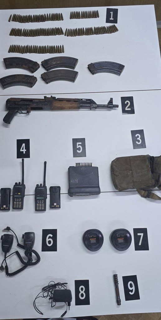 Sipas njoftimit të PK-së, dëshmitë të cilat janë gjetur dhe konfiskuar janë: një AK-47, pesë karikatorë me municion të AK 47, 136 fishekë të AK-47, një çantë krahu, dy radio-lidhje të dorës, një radio lidhje për veturë, dy mbushës radiolidhjesh, si dhe një tytë shtesë e AK-47.